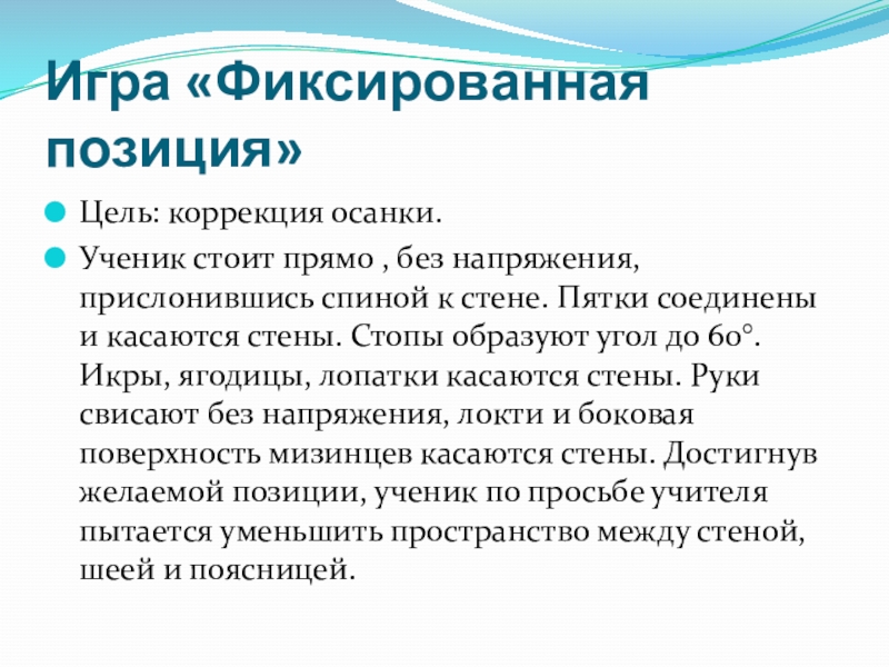 спиной к стене. Пятки соединены и касаются стены. Стопы образуют угол до 60°. Икры, ягодицы, лопатки касаются стены. Руки свисают без напряжения, локти и боковая поверхность мизинцев касаются стены. Достигнув желаемой позиции, ученик по просьбе учителя пытается уменьшить пространство между стеной, шеей и поясницей.