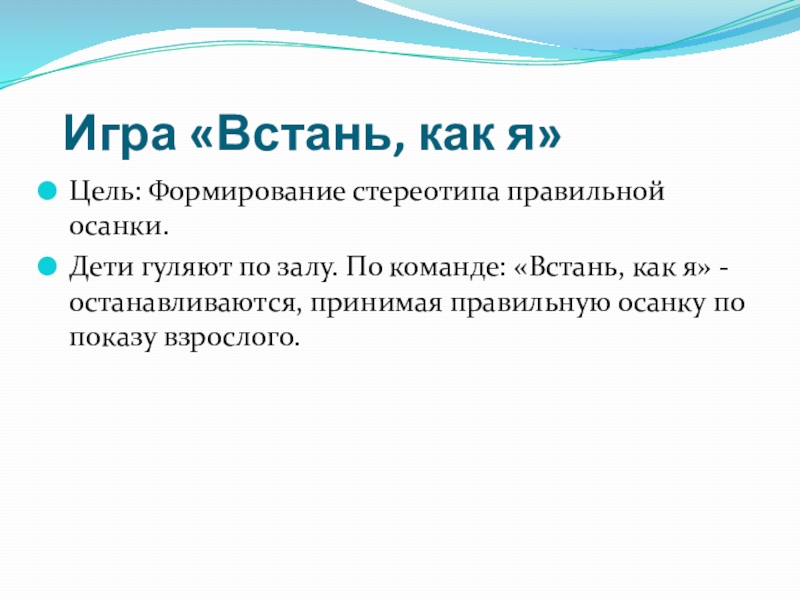 залу. По команде: «Встань, как я» - останавливаются, принимая правильную осанку по показу взрослого.