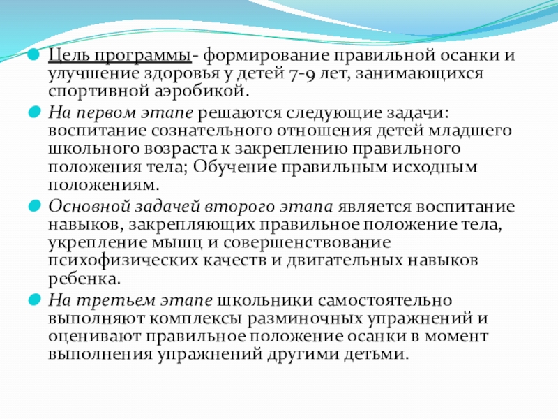 Слайд 16Цель программы- формирование правильной осанки и улучшение здоровья у детей 7-9