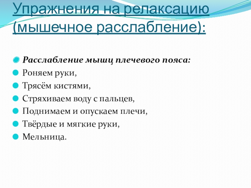 Слайд 20Упражнения на релаксацию (мышечное расслабление):