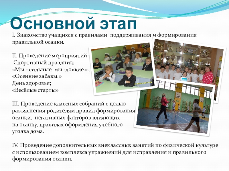 На первом этапе решаются следующие задачи: воспитание сознательного отношения детей младшего школьного возраста к закреплению правильного положения тела; Обучение правильным исходным положениям.