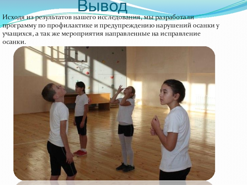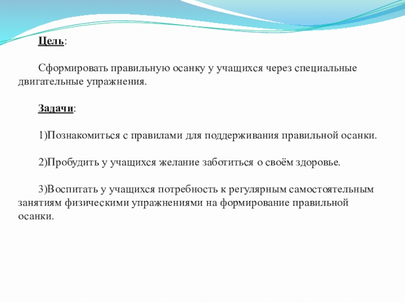 3)Воспитать у учащихся потребность к регулярным самостоятельным занятиям физическими упражнениями на формирование правильной осанки.