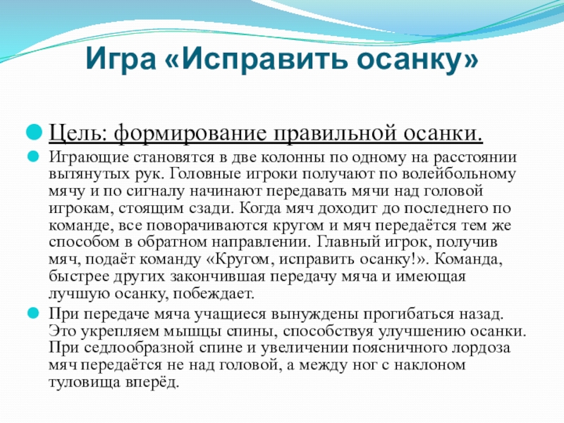 одному на расстоянии вытянутых рук. Головные игроки получают по волейбольному мячу и по сигналу начинают передавать мячи над головой игрокам, стоящим сзади. Когда мяч доходит до последнего по команде, все поворачиваются кругом и мяч передаётся тем же способом в обратном направлении. Главный игрок, получив мяч, подаёт команду «Кругом, исправить осанку!». Команда, быстрее других закончившая передачу мяча и имеющая лучшую осанку, побеждает.