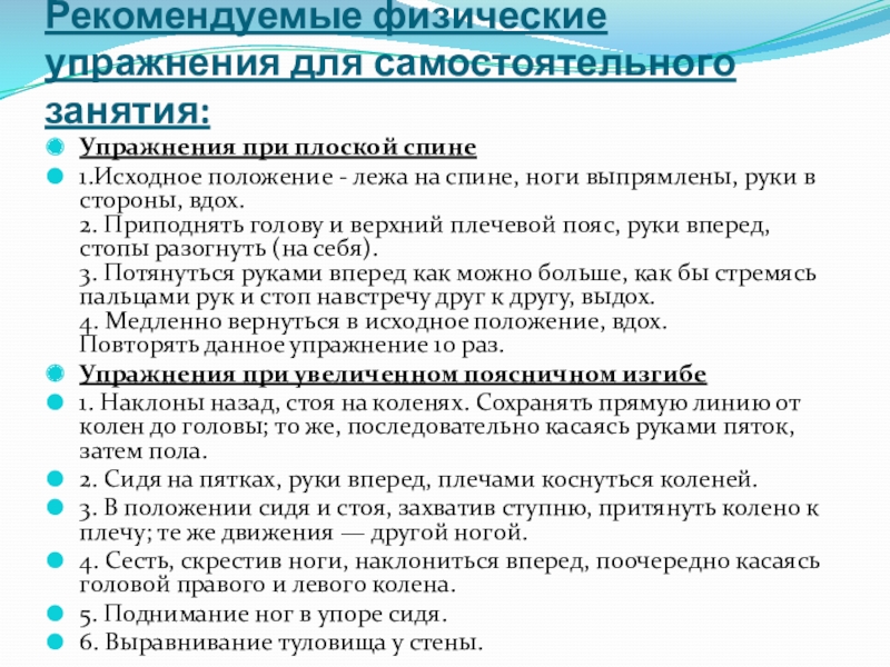 Слайд 19Рекомендуемые физические упражнения для самостоятельного занятия:
