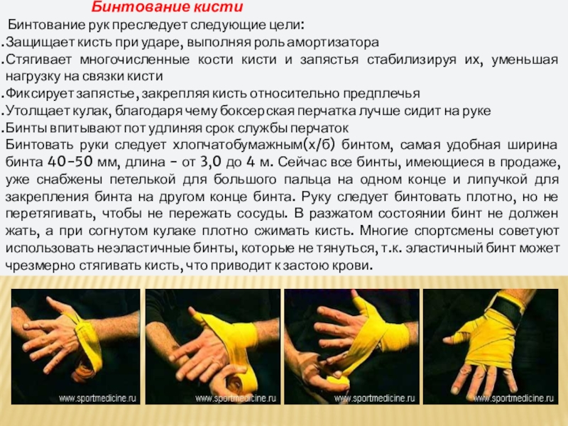 Бинтовать руки следует хлопчатобумажным(х/б) бинтом, самая удобная ширина бинта 40-50 мм, длина - от 3,0 до 4 м. Сейчас все бинты, имеющиеся в продаже, уже снабжены петелькой для большого пальца на одном конце и липучкой для закрепления бинта на другом конце бинта. Руку следует бинтовать плотно, но не перетягивать, чтобы не пережать сосуды. В разжатом состоянии бинт не должен жать, а при согнутом кулаке плотно сжимать кисть. Многие спортсмены советуют использовать неэластичные бинты, которые не тянуться, т.к. эластичный бинт может чрезмерно стягивать кисть, что приводит к застою крови.