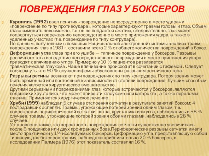 удара» и «повреждение по типу противоудара», которые характеризуют травмы головы и глаз. Объем глаза изменить невозможно, т.е. он не поддается сжатию, следовательно, глаз может подвергнуться повреждению непосредственно в месте приложения удара, а также в удаленных участках (т.е. повреждение по типу контрудара).