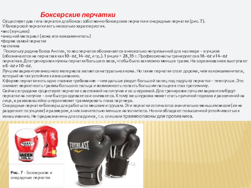 Поскольку родина бокса Англия, то вес перчаток обозначается в несколько непривычной для нас мере - в унциях (обозначаются на перчатках как 10-oz, 14-oz, и тд.). 1 унция = 28,35 г. Профессионалы тренируются в 16-oz и 14-oz перчатках. Для тренировок нужны перчатки большего веса, чтобы было как можно меньше травм. На соревнованиях выступают в 8-oz и 10-oz.