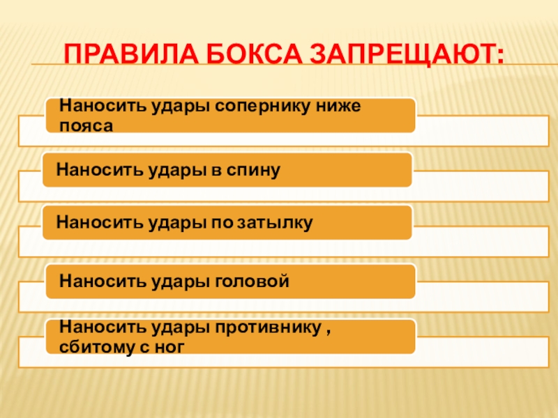 В боксе разрешаются удары только определенной часть сжатого кулака, одетого в мягкую перчатку. Разрешаются удары только в переднюю часть головы и туловища.