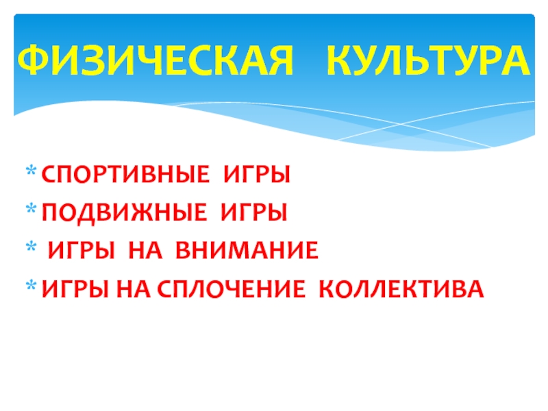 СПОРТИВНЫЕ ИГРЫ  ПОДВИЖНЫЕ ИГРЫ ИГРЫ НА ВНИМАНИЕ ИГРЫ НА СПЛОЧЕНИЕ КОЛЛЕКТИВА