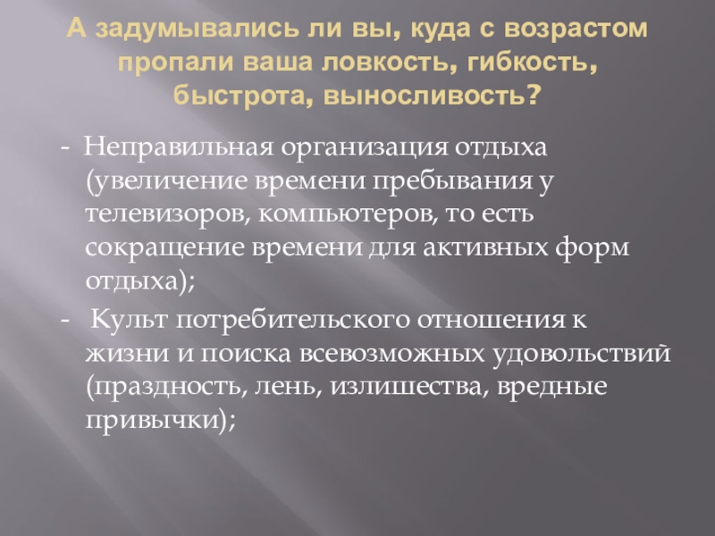 - Неправильная организация отдыха (увеличение времени пребывания у телевизоров, компьютеров, то есть сокращение времени для активных форм отдыха);