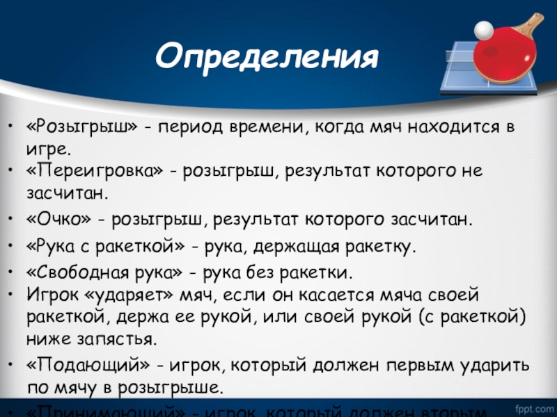 Игрок «ударяет» мяч, если он касается мяча своей ракеткой, держа ее рукой, или своей рукой (с ракеткой) ниже запястья.