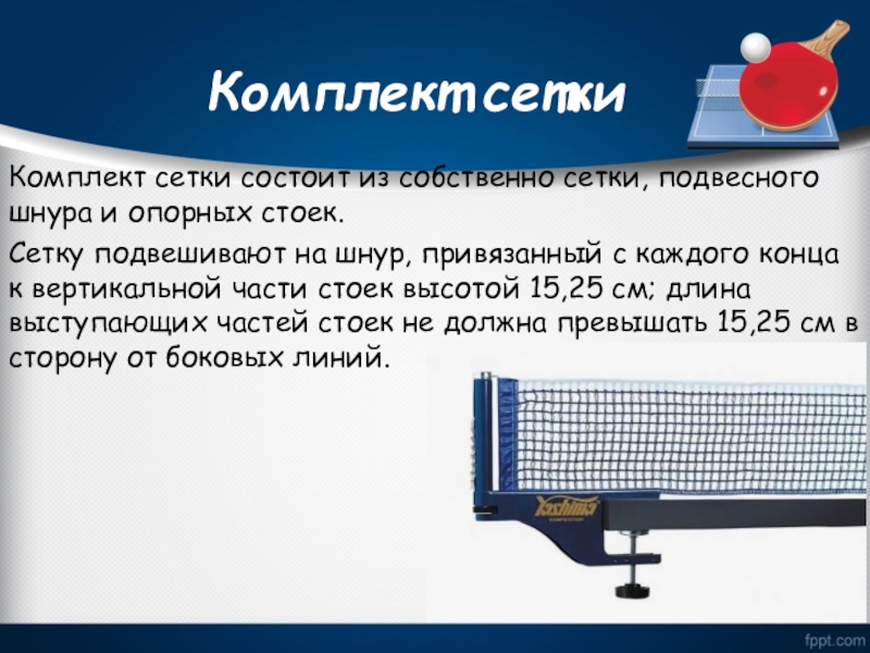 Комплект сетки состоит из собственно сетки, подвесного шнура и опорных