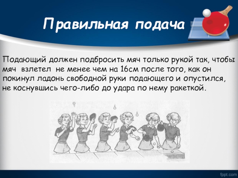 Подающий должен подбросить мяч только рукой так, чтобы мяч взлетел