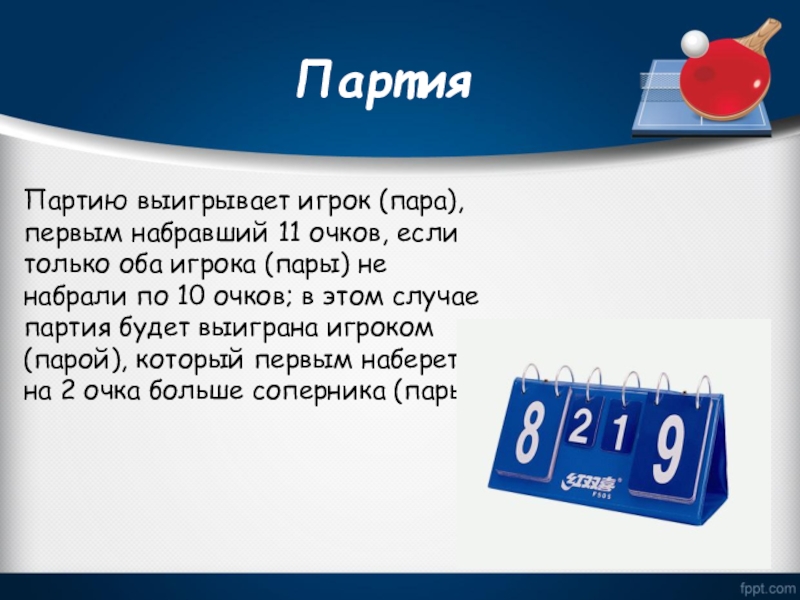 игрока (пары) не набрали по 10 очков; в этом случае партия будет выиграна игроком (парой), который первым наберет на 2 очка больше соперника (пары).
