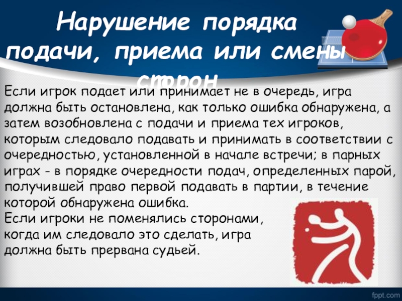 не в очередь, игра должна быть остановлена, как только ошибка обнаружена, а затем возобновлена с подачи и приема тех игроков, которым следовало подавать и принимать в соответствии с очередностью, установленной в начале встречи; в парных играх - в порядке очередности подач, определенных парой, получившей право первой подавать в партии, в течение которой обнаружена ошибка.