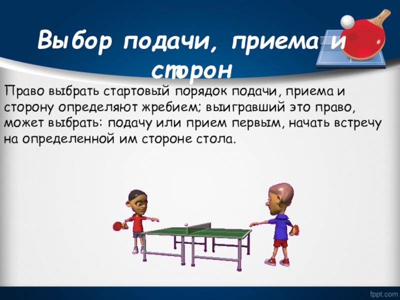 сторону определяют жребием; выигравший это право, может выбрать: подачу или прием первым, начать встречу на определенной им стороне стола.