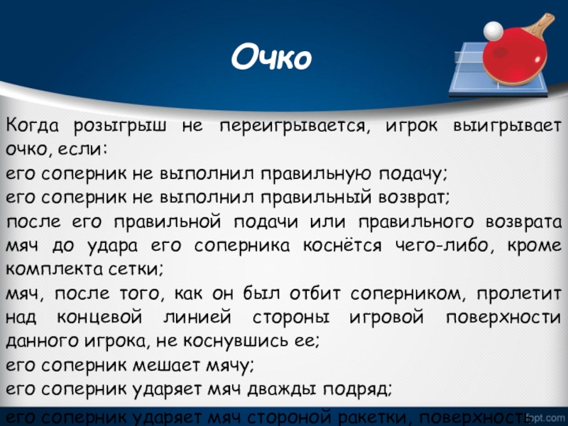 Когда розыгрыш не переигрывается, игрок выигрывает очко, если: