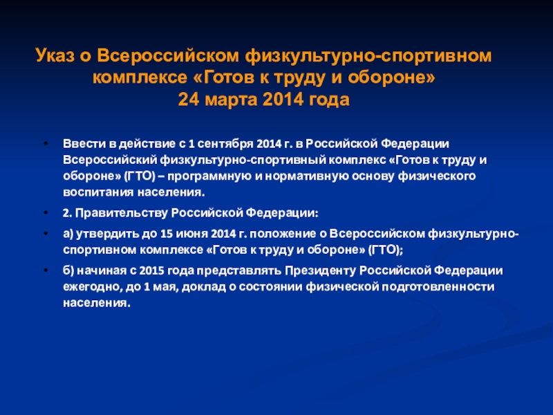Ввести в действие с 1 сентября 2014 г. в Российской Федерации Всероссийский физкультурно-спортивный комплекс «Готов к труду и обороне» (ГТО) – программную и нормативную основу физического воспитания населения.