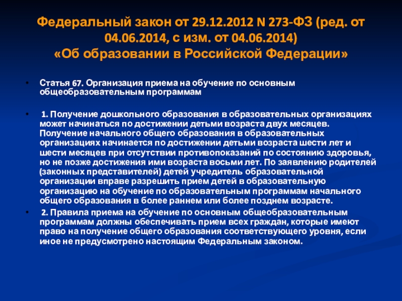 Статья 67. Организация приема на обучение по основным общеобразовательным программам