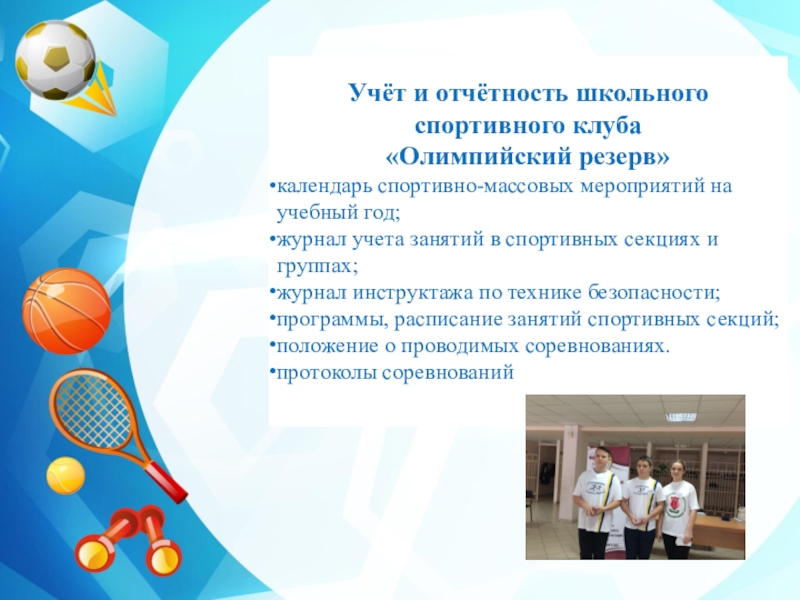 Слайд 29Учёт и отчётность школьного спортивного клуба