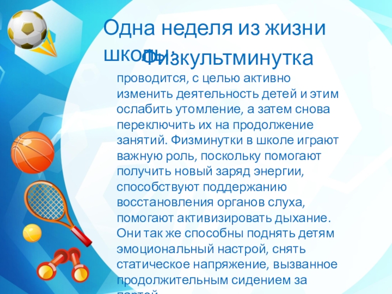 активно изменить деятельность детей и этим ослабить утомление, а затем снова переключить их на продолжение занятий. Физминутки в школе играют важную роль, поскольку помогают получить новый заряд энергии, способствуют поддержанию восстановления органов слуха, помогают активизировать дыхание. Они так же способны поднять детям эмоциональный настрой, снять статическое напряжение, вызванное продолжительным сидением за партой.