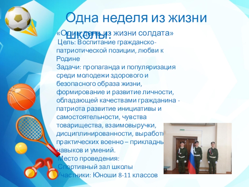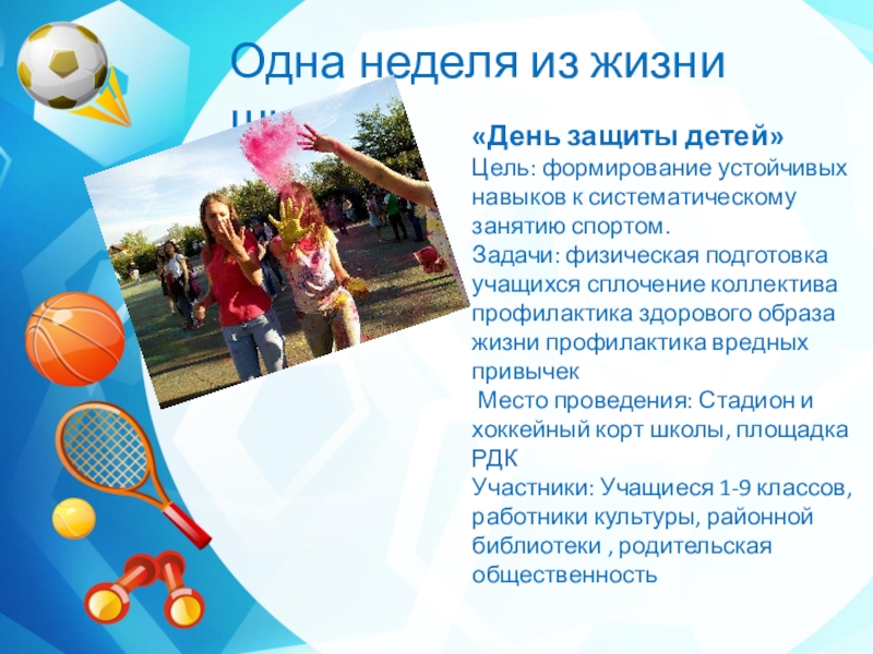 Задачи: Привлечение к занятиям различными видами спорта. Формирование физической культуры личности с учётом индивидуальных способностей. Сплочение классных коллектив, воспитание дружбы и коллективизма.