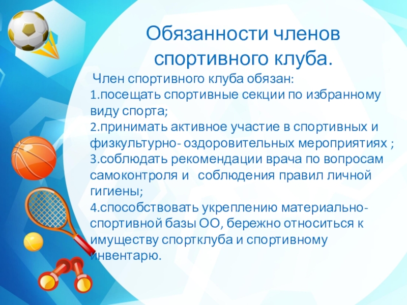 4.способствовать укреплению материально-спортивной базы ОО, бережно относиться к имуществу спортклуба и спортивному инвентарю.
