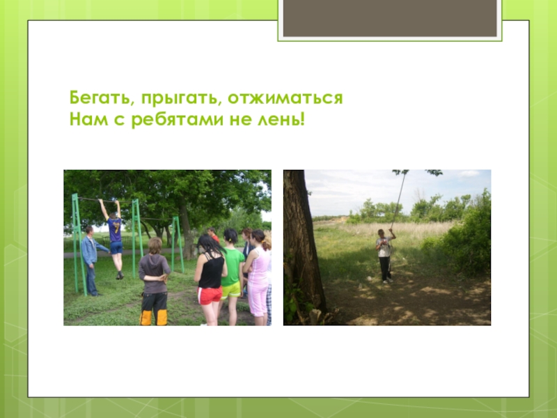 Слайд 5Бегать, прыгать, отжиматься Нам с ребятами не лень!