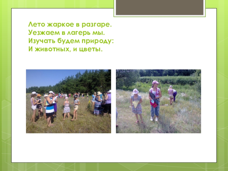 Слайд 10Лето жаркое в разгаре. Уезжаем в лагерь мы. Изучать будем природу: И животных, и