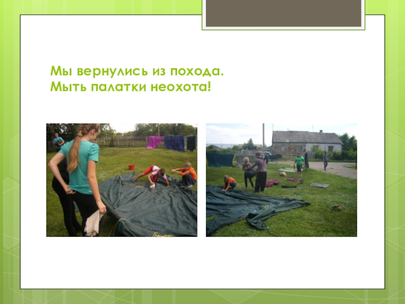 Слайд 13Мы вернулись из похода. Мыть палатки неохота!