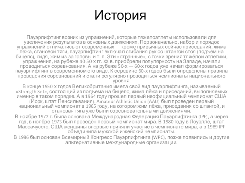 основных движениях. Первоначально, набор и порядок упражнений отличались от современных — кроме привычных сейчас приседаний, жима лежа, становой тяги, пауэрлифтинг включал сгибания рук со штангой стоя (подъем на бицепс), сидя, жим из-за головы и т. п. Эти «странные», с точки зрения тяжёлой атлетики, упражнения, на рубеже 40-50-х гг. XX в. приобрели популярность на Западе, начали проводиться соревнования. А на рубеже 50-х — 60-х годов уже начал формироваться пауэрлифтинг в современном его виде. К середине 60-х годов были определены правила проведения соревнований и стали регулярно проводиться чемпионаты национального уровня.