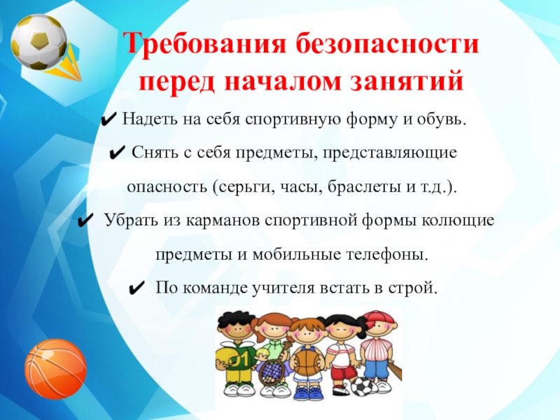 Требования безопасности перед началом занятий Надеть на себя спортивную форму и обувь. Снять с себя
