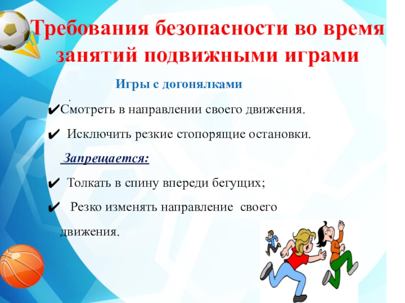 . Требования безопасности во время занятий подвижными играми Смотреть в направлении своего движения. Исключить резкие стопорящие