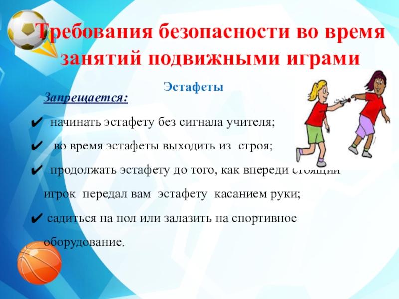 Требования безопасности во время занятий подвижными играми . Эстафеты  Запрещается: начинать эстафету без сигнала учителя;