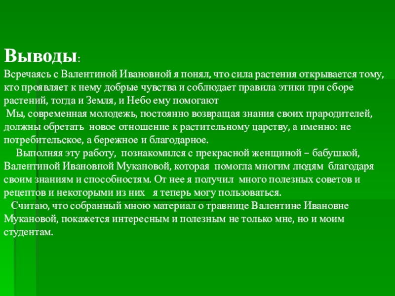 Выполняя эту работу, познакомился с прекрасной женщиной – бабушкой, Валентиной Ивановной Мукановой, которая помогла многим людям благодаря своим знаниям и способностям. От нее я получил много полезных советов и рецептов и некоторыми из них я теперь могу пользоваться.