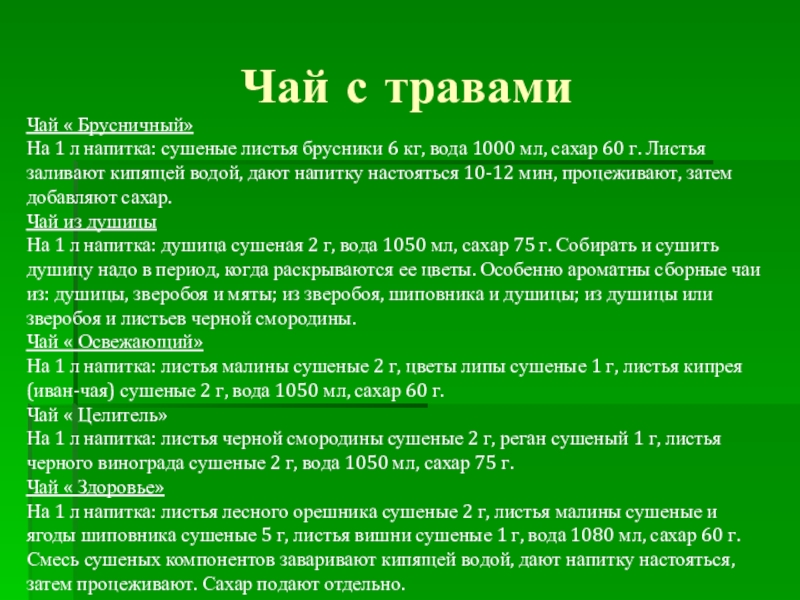 На 1 л напитка: цветы терновника сушеные 1 г, цветы липы сушеные 1 г, листья малины сушеные 2 г, листья ежевики сушеные 2 г, воды 1070 мл.