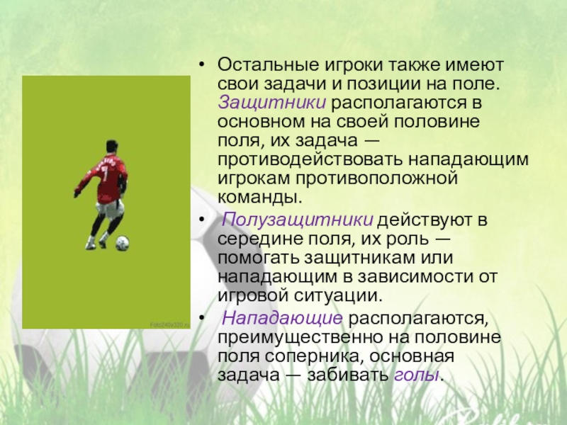 Слайд 6Остальные игроки также имеют свои задачи и позиции на поле. Защитники