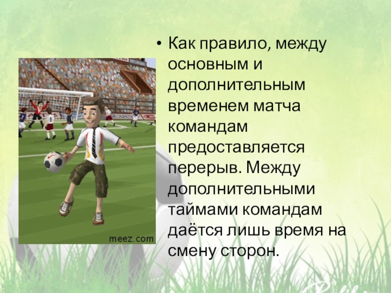 Слайд 8Как правило, между основным и дополнительным временем матча командам предоставляется перерыв.
