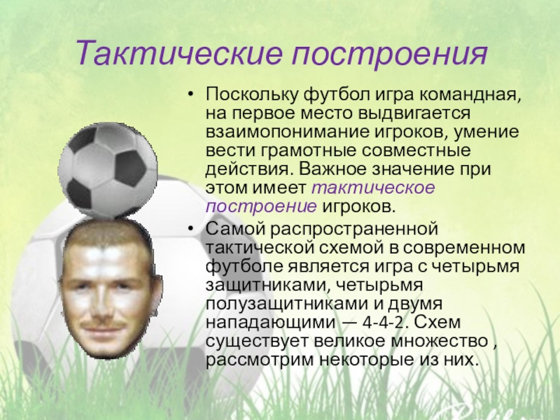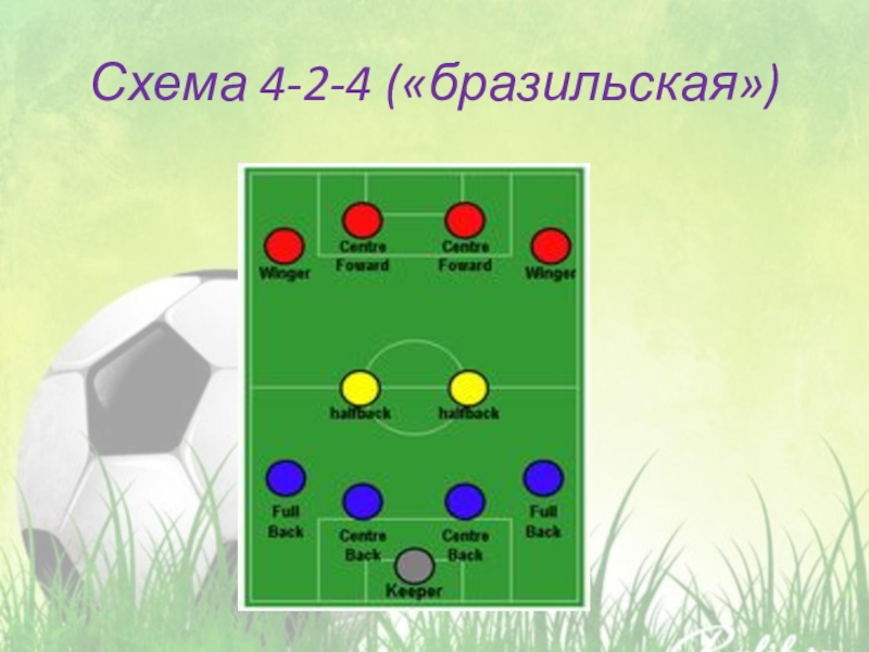 Самой распространенной тактической схемой в современном футболе является игра с четырьмя защитниками, четырьмя полузащитниками и двумя нападающими — 4-4-2. Схем существует великое множество , рассмотрим некоторые из них.