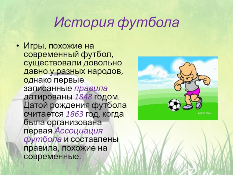 народов, однако первые записанные правила датированы 1848 годом. Датой рождения футбола считается 1863 год, когда была организована первая Ассоциация футбола и составлены правила, похожие на современные.