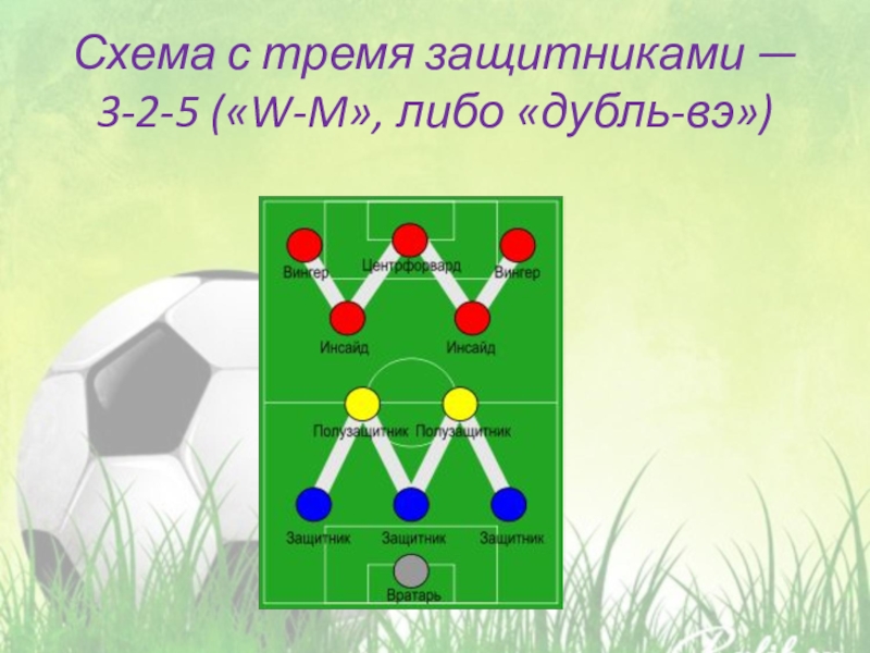 Слайд 12Схема с тремя защитниками — 3-2-5 («W-M», либо «дубль-вэ»)