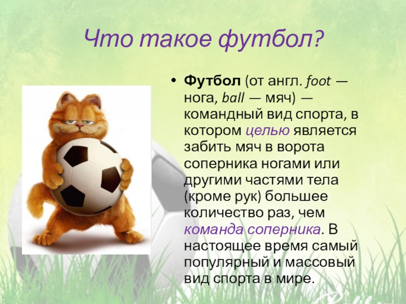 Футбол (от англ. foot — нога, ball — мяч) — командный вид спорта,