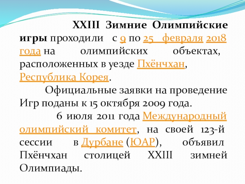 Слайд 2 XXIII Зимние Олимпийские игры проходили с 9 по 25 февраля 2018