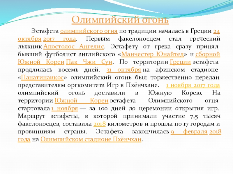 октября 2017 года. Первым факелоносцем стал греческий лыжник Апостолос Ангелис. Эстафету от грека сразу принял бывший футболист английского «Манчестер Юнайтед» и сборной Южной Кореи Пак Чжи Сун. По территории Греции эстафета продлилась восемь дней. 31 октября на афинском стадионе «Панатинаикос» олимпийский огонь был торжественно передан представителям оргкомитета Игр в Пхёнчхане. 1 ноября 2017 года олимпийский огонь доставили в Южную Корею. На территории Южной Кореи эстафета Олимпийского огня стартовала 1 ноября — за 100 дней до церемонии открытия игр. Маршрут эстафеты, в которой принимали участие 7,5 тысяч факелоносцев, составила 2018 километров и прошла по 17 городам и провинциям страны. Эстафета закончилась 9 февраля 2018 года на Олимпийском стадионе Пхёнчхан.