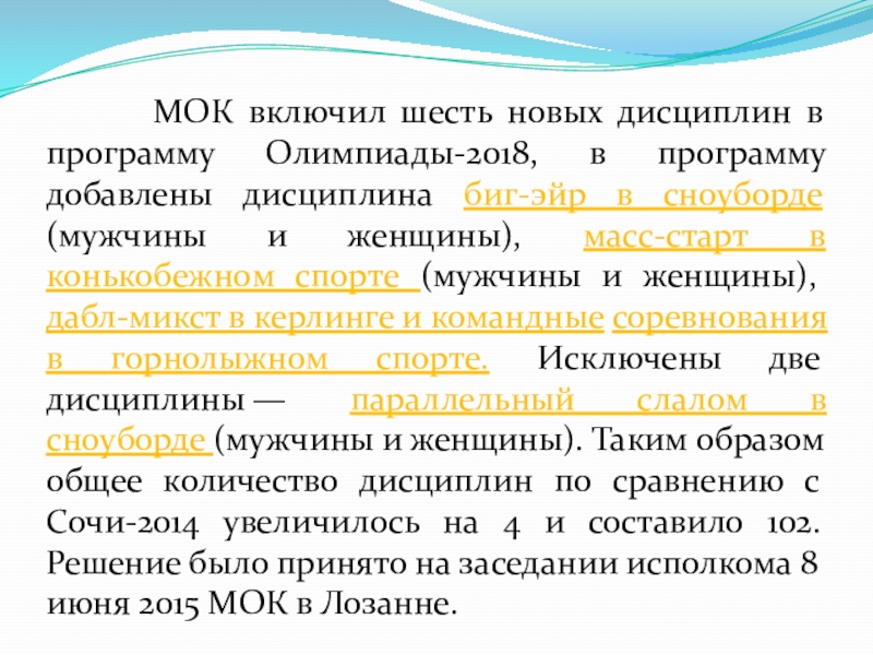 Олимпиады-2018, в программу добавлены дисциплина биг-эйр в сноуборде (мужчины и женщины), масс-старт в конькобежном спорте (мужчины и женщины), дабл-микст в керлинге и командные соревнования в горнолыжном спорте. Исключены две дисциплины — параллельный слалом в сноуборде (мужчины и женщины). Таким образом общее количество дисциплин по сравнению с Сочи-2014 увеличилось на 4 и составило 102. Решение было принято на заседании исполкома 8 июня 2015 МОК в Лозанне.
