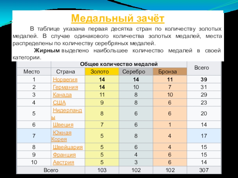 количеству золотых медалей. В случае одинакового количества золотых медалей, места распределены по количеству серебряных медалей.
