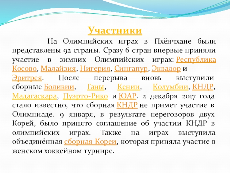 страны. Сразу 6 стран впервые приняли участие в зимних Олимпийских играх: Республика Косово, Малайзия, Нигерия, Сингапур, Эквадор и Эритрея. После перерыва вновь выступили сборные Боливии, Ганы, Кении, Колумбии, КНДР, Мадагаскара, Пуэрто-Рико и ЮАР. 2 декабря 2017 года стало известно, что сборная КНДР не примет участие в Олимпиаде. 9 января, в результате переговоров двух Корей, было принято соглашение об участии КНДР в олимпийских играх. Также на играх выступила объединённая сборная Кореи, которая приняла участие в женском хоккейном турнире.