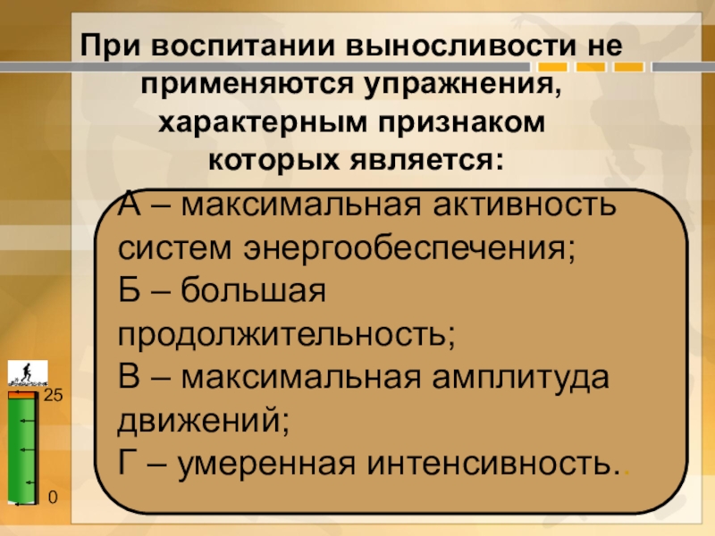 При воспитании выносливости не применяются упражнения, характерным признаком