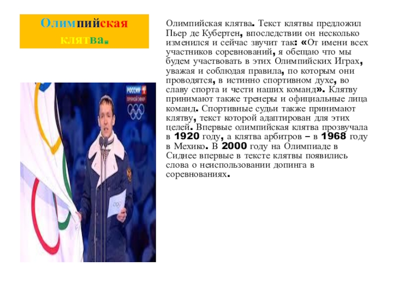 он несколько изменился и сейчас звучит так: «От имени всех участников соревнований, я обещаю что мы будем участвовать в этих Олимпийских Играх, уважая и соблюдая правила, по которым они проводятся, в истинно спортивном духе, во славу спорта и чести наших команд». Клятву принимают также тренеры и официальные лица команд. Спортивные судьи также принимают клятву, текст которой адаптирован для этих целей. Впервые олимпийская клятва прозвучала в 1920 году, а клятва арбитров – в 1968 году в Мехико. В 2000 году на Олимпиаде в Сиднее впервые в тексте клятвы появились слова о неиспользовании допинга в соревнованиях.