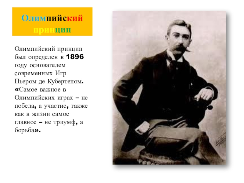 Игр Пьером де Кубертеном. «Самое важное в Олимпийских играх – не победа, а участие, также как в жизни самое главное – не триумф, а борьба».